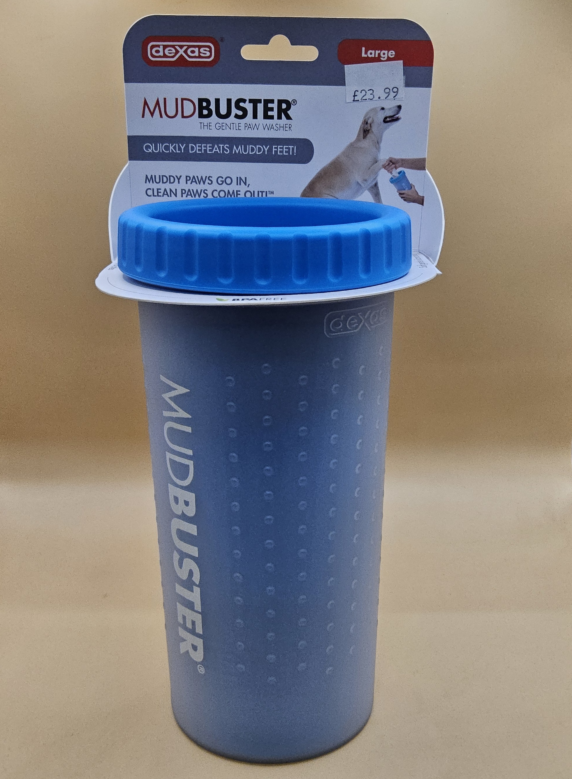 The Dexas MudBuster easily washes dirty feet! It provides a quick, gentle yet thorough cleaning of a dog's muddy paws.